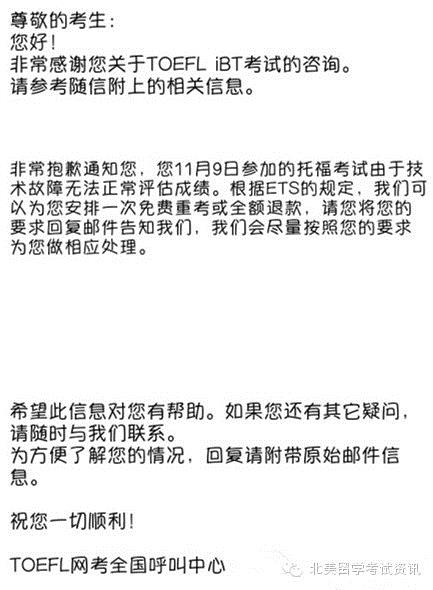 目前11月8日和11月9日参加托福考试的考生很多都和小编抱怨,说还没查询到自己的成绩,按照ETS以往的出分惯例,10个工作日即可查看成绩,11月18日和19日照理说是应该能够正常查询的。小编老师的部分考生在今天收到ETS的短信/email通知,告知“由于技术故障,11月8日和9日的托福考试无法正常评估成绩,ETS将免费为在11月8日和9日参加过托福考试的学生再安排一次考试或者全额退款”,目前接收到ETS信息通知的考生还只是少数,之前也有过相同情况的发生,如下图: